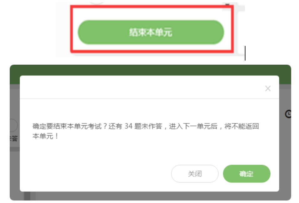 (2)考试包含多个单元,需先结束当前单元后进入下一单元的答题(如下图所示);(注意:结束单元后不可再返回修改答案,考生必须确认已经完成本单元答题后再结束当前单元)