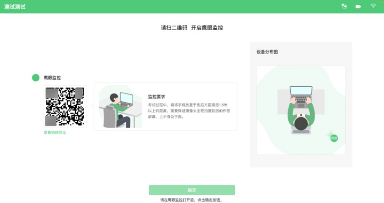 (5)云监考(鹰眼)监控开启且按照要求架设后,在考试设备的界面上点击“确定”按钮(如下图所示)进行考试;