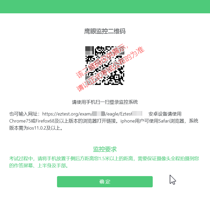 (2)如使用IOS设备(iPhone、iPad)作为监控设备,扫描二维码后依据提示使用Safari浏览器打开云监考(鹰眼)监控,安卓机型扫描二维码后选择使用推荐浏览器(谷歌或火狐)登录云监考(鹰眼)监控,打开云监考(鹰眼)监控后点击“进入监控”按钮,进入下一页。