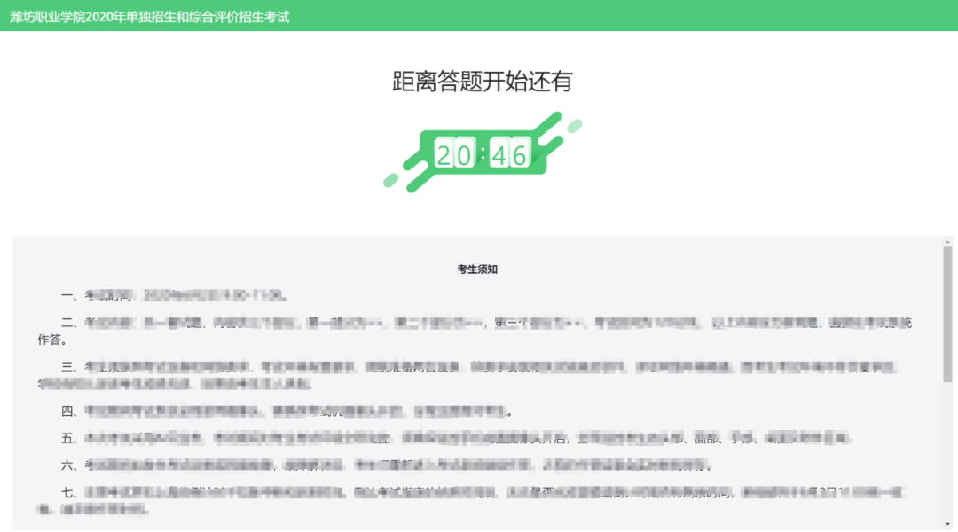 架设好鹰眼监控后,若未到考试开始时间,则先进入候考界面,认真阅读考生须知,做好笔试考试前的最后准备事项。(注意:准点和迟到登录的考生无候考页面)