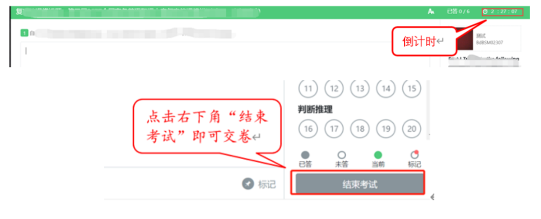 页面右上角的倒计时为试卷时长倒计时。考试结束时间以准考证上的时间为准,时间一到会统一结束考试。答题结束后,考生可以点击界面右下角的“结束考试”按钮交卷。(如下图所示)