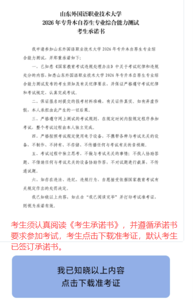3.考生须认真阅读考生承诺书,并履行承诺书要求,“点击下载准考证”默认考生已签订考生承诺书。
