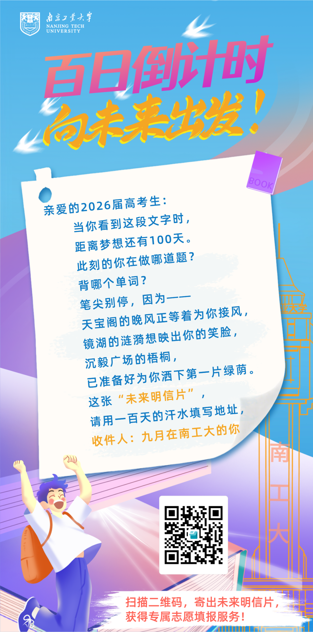 今年9月,招办将对照新生名单——凡成功考入南京工业大学的同学,可在报到当天收获招办精心准备的南工大定制专属未来明信片套装及打卡留念。