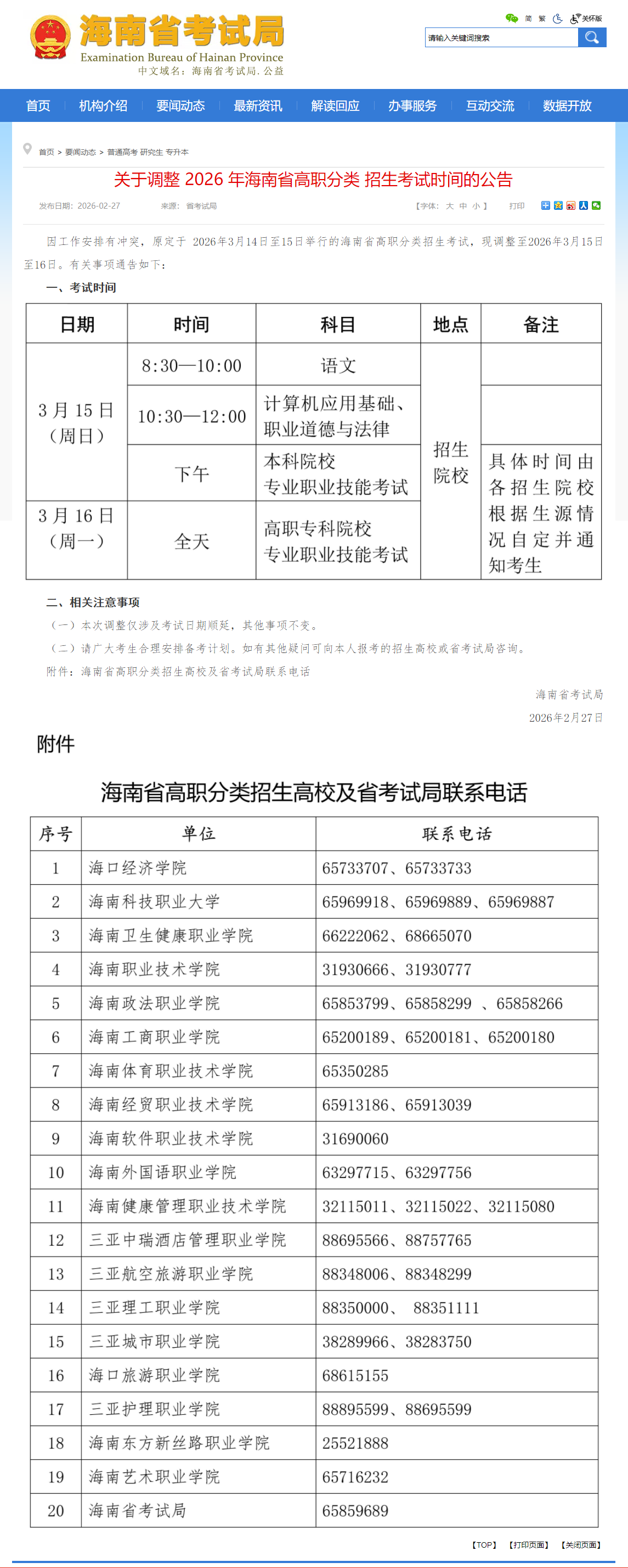 关于调整 2026 年海南省高职分类 招生考试时间的公告