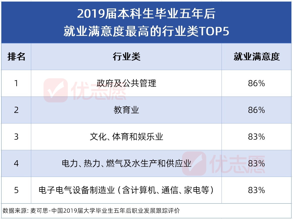 就业满意度,是衡量一个行业是否值得长期投入的重要标准。对于面临专业选择的高中生与家长而言,提前了解哪些行业稳定、有前景、认可度高,能从根源上减少未来的职业弯路。今天,小优基于麦可思研究2019届本科生毕业五年就业满意度