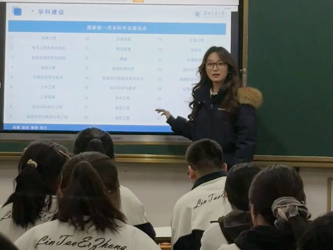 寒假期间,我很荣幸回到母校淮南二中,开展了兰州交通大学的招生宣讲活动。站在熟悉的讲台,看着学弟学妹们求知的眼神,我倍感亲切与责任。我详细介绍了兰交大的学科优势、校园文化及就业前景,并结合自身经历分享了大学生活的方方面面。此次宣讲不仅锻炼了我的表达能力,更让我深刻体会到母校情结的珍贵。希望通过我的分享,能让更多二中学子了解兰交大,也期待未来能与他们在金城兰州相聚。