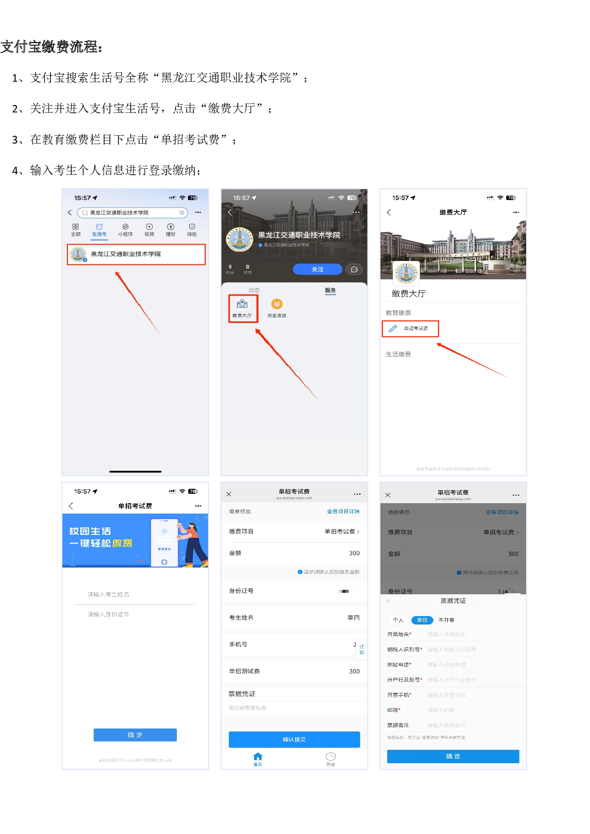 依据我校2026年高职单独招生章程规定,参加我校单招考试的考生需缴纳单招考试费300元/生,缴费时间:2026年3月9日00:00开始至3月10日15:00截止,未在规定时间完成缴费,后续将无法打印准考证参加考试视为自动放弃,考生请自行选择使用微信或支付宝缴费方式完成缴费,缴费流程详见流程图步骤操作完成,单招考试打印准考证及考试须知将在缴费时间结束后另行通知。