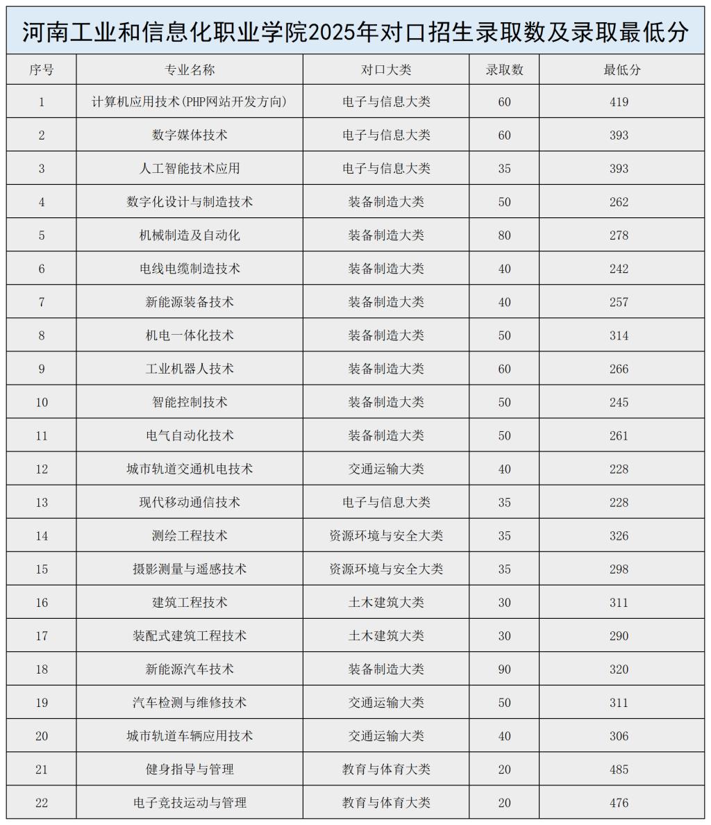河南工业和信息化职业学院2025年对口招生录取数及录取最低分