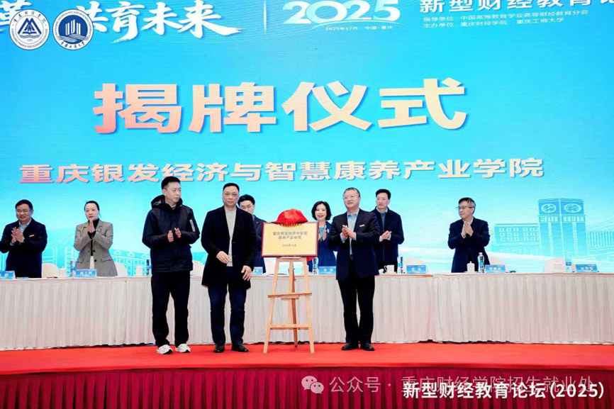 开幕式现场,重庆市养老服务协会郭恒良常务副秘书长,重庆财经学院吴华安校长,重庆宏善实业集团有限公司杨沛副总裁为“重庆银发经济与智慧康养产业学院”揭牌,标志着重庆财经学院在深化产教融合、推动新财经与新工科、新文科交叉融合方面迈出坚实步伐。