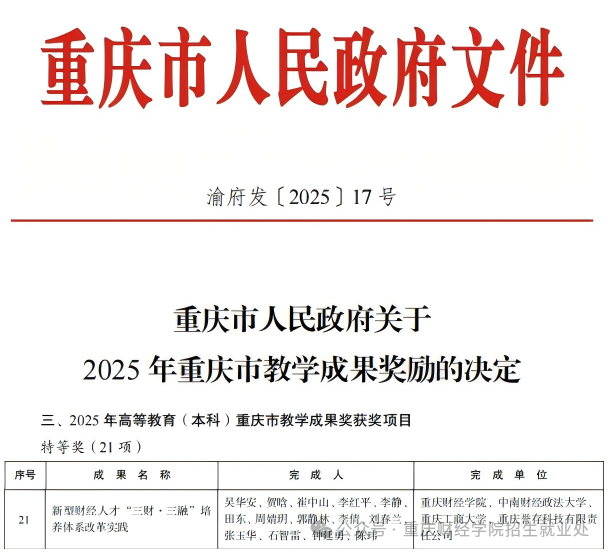 近日,重庆市人民政府发布《关于2025年重庆市教学成果奖励的决定》,重庆财经学院《新型财经人才“三财·三融”培养体系改革实践》项目喜获2025 年高等教育(本科)重庆市教学成果奖特等奖,实现了我校历史性重大突破,彰显了学校在财经教育领域的创新实力。