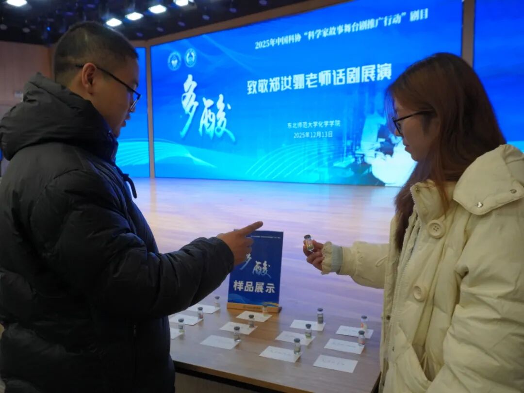 本次创排与展演得到了中国科协青少年科技中心、吉林省科学技术协会的大力支持。多年来,东北师大始终坚持弘扬科学家精神,深入挖掘校史文化,打造沉浸式学生思想政治教育场域。话剧《多酸》已连续展演5年,坚持“让学生演老师,让学生演学长”的特色模式,从剧本打磨、导演构思到舞台呈现,全过程均由化学学院学生自主完成,现已成为学院推进科学文化与思政育人深度融合的品牌项目。展演期间,演出现场还设置了多酸样品展示区,将舞台艺术与科学实物相结合,使学生近距离、多维度地感受多酸的科学魅力,进一步拓展了活动的教育内涵与科普功能。