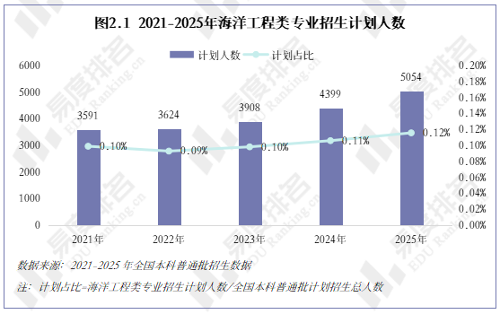 五年间,海洋工程类专业招生计划从3591人增至5054人,累计增加1463人,增幅达40.7%。在全国本科招生总盘趋于稳定的背景下,招生占比从0.10%提升至0.12%,虽然绝对比例仍低,但连续四年保持增长。
