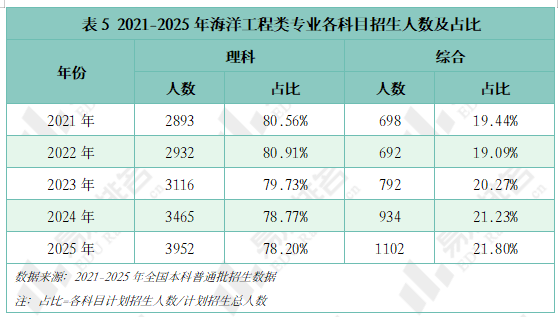 海洋工程类专业以理科生源绝对主导,但占比呈缓慢下降趋势。综合改革省份生源持续扩大,增幅远高于理科增幅。2025年综合省份招生1102人,占比21.80%,绝对人数和相对占比均创五年新高,新高考改革对生源结构持续影响。