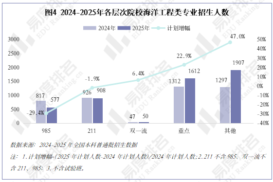 985及211院校招生计划下滑,其中985院校的降幅最大,接近三成。海洋工程类专业的招生重心正在系统性下移。重点及其他院校占比从59.3%升至69.6%,人才培养的应用化特征日益显著。