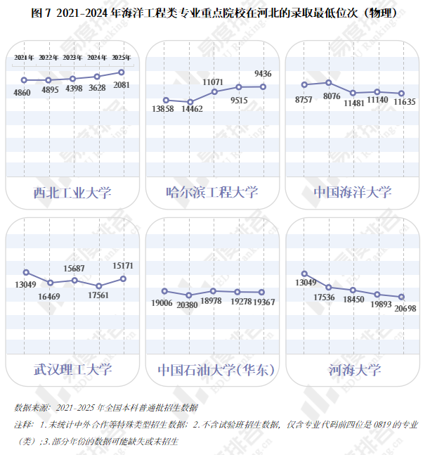 在河北省物理类录取中,以录取最低位次靠前的六所985、211院校为例,海洋工程类专业的吸引力呈明显分化。西北工业大学与哈尔滨工程大学凭借深厚的国防军工背景,在“海洋强国”战略驱动下,录取位次持续攀升,生源吸引力显著增强。相比之下,河海大学的同类专业则出现位次下滑,而中国海洋大学自2023年起在河北新增海洋资源开发技术专业招生,其录取位次略低于该校传统的船舶与海洋工程专业,但整体来看,学校在海洋工程相关领域仍具备稳定的生源认可度。