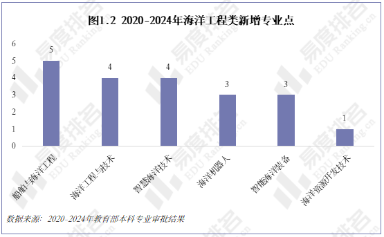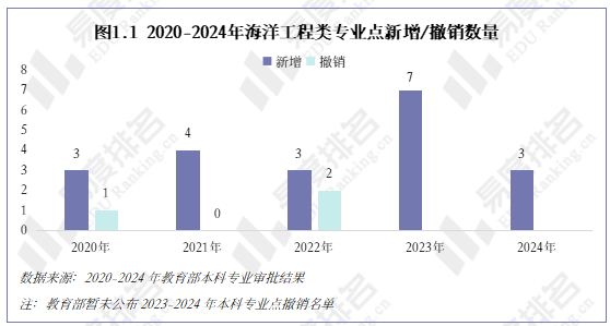 在2020至2024年间,全国高校共新增海洋工程类专业点20个,年度新增数量大多稳定在3至4个。其中,2023年成为新增高峰,当年共增设7个专业点。整体来看,该学科领域建设步伐稳健,未出现大规模专业撤销现象。