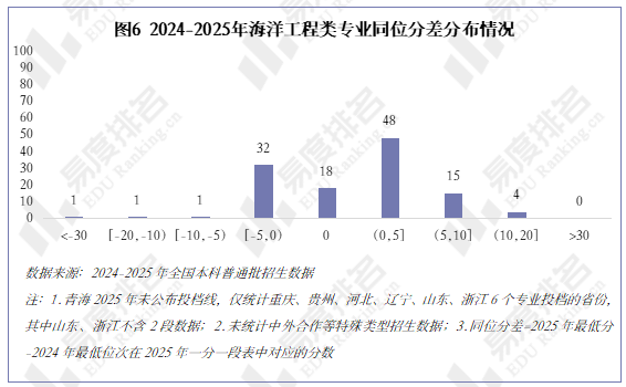 2025年所统计的海洋工程类专业录取同位分差整体上涨,56%的专业分数上涨,29%的专业分数有所下降,其中16%的专业上涨超过5分。考生对海洋工程类专业的报考热情明显升温。