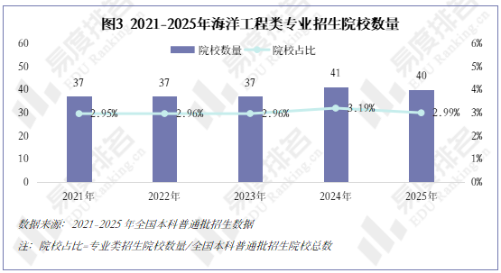 海洋工程类专业招生院校五年间从37所增至40所,最高达41所,净增3所。该专业办学门槛较高,新增院校数量远低于全国院校增量。