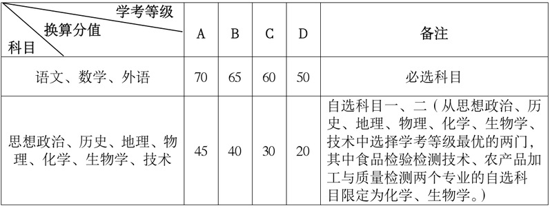 2.普高招生考生高中学考等级要求:①无E等级;②语文、数学、外语为必选科目;③自选科目两门,从思想政治、历史、地理、物理、化学、生物学、技术中选择学考等级最优的两门,其中食品检验检测技术、农产品加工与质量检测两个专业的自选科目限定为化学、生物学;④高中学考等级以浙江省教育考试院提供的成绩为准。