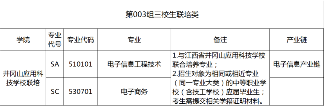 003组三校生联培类供相同或相近专业(同一专业大类)的中职学校(含技工学校)应届毕业生考生填报,高考考生号第9、10位为89,填报该专业组的考生需在3月18日提交学籍材料(学籍表复印件)并加盖中专毕业学校公章至吉安职业技术学院行政楼201办公室,专业组内可填报专业如下:
