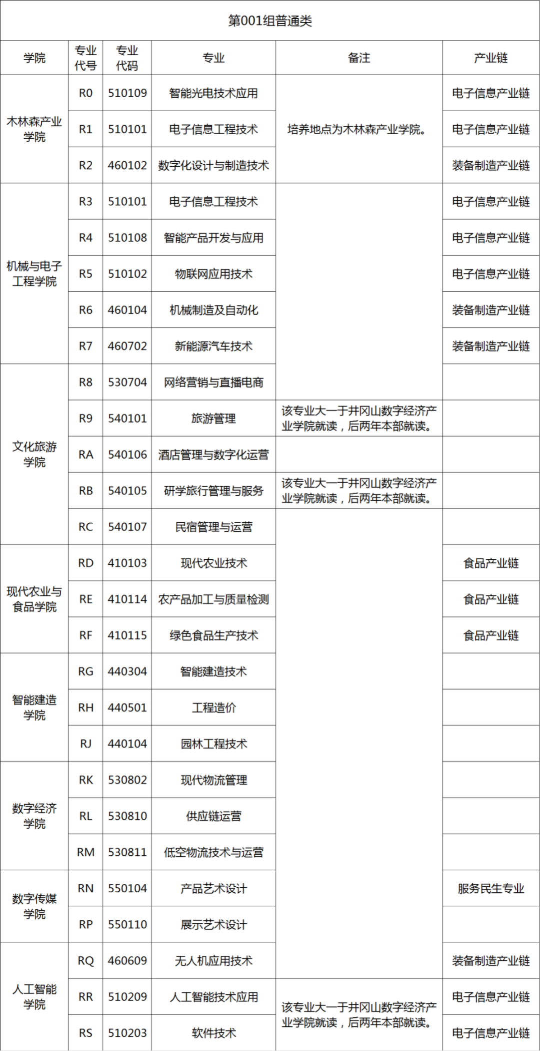 001组普通类供普通类(物理组、历史组)考生填报,高考考生号第9、10位为11或15,专业组内可填报专业如下: