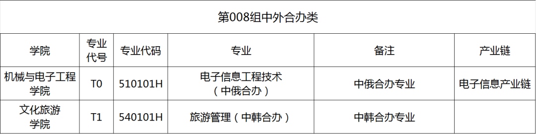 008组中外合办类普通类(物理科目组、历史科目组)考生和三校生均可填报,专业组内可填报专业如下: