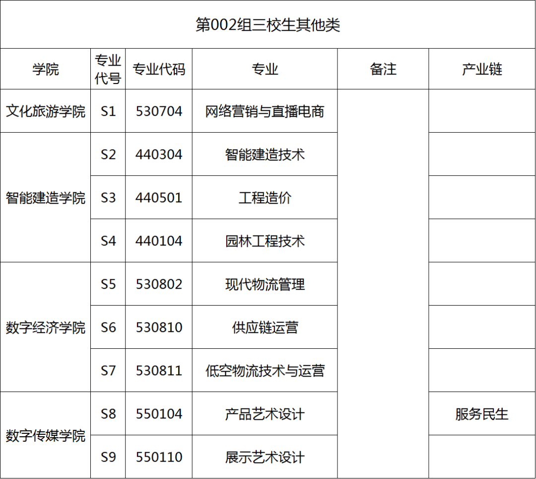 002组三校生其他类供三校生填报,高考考生号第9、10位为89,专业组内可填报专业如下: