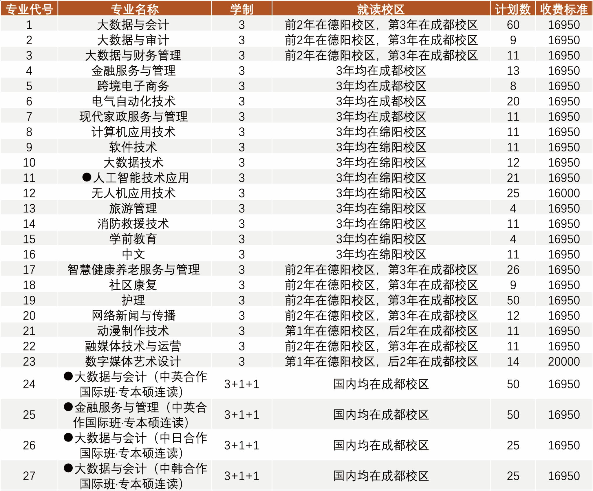 3、专业名称和学费两栏中带·者,除专科学费外,还需缴纳其它费用。其中,报名人工智能技术应用专业的新生需向校企合作方缴纳产教融合专项培养费;报名专本硕连读双文凭国际班的新生需缴纳专项培训费(详情请查看我校官网)。专本硕连读双文凭国际班计划招生人数包含在高职单招总计划中,不单列。