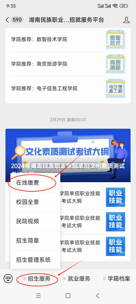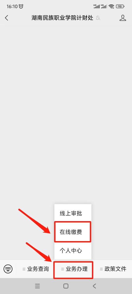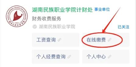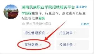 第一步:关注微信公众号“湖南民族职业学院计财处”或“湖南民族职业学院招就服务平台”或“湖南民族职业学院官微,点击“业务办理(或招生服务)”中的“在线缴费”;