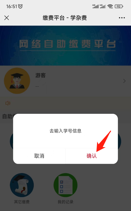 第二步:进入自助缴费平台,首次登录点击“游客”、“确认”(切换学生信息登录点击图标);