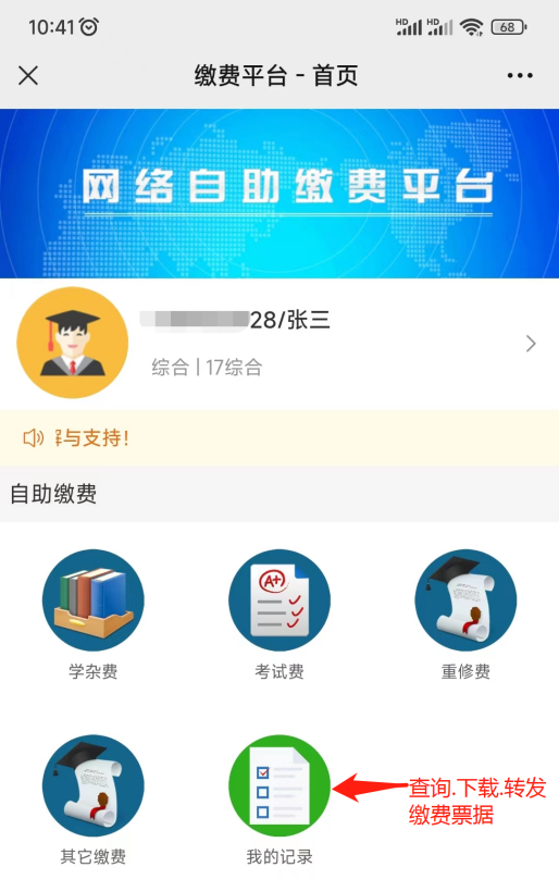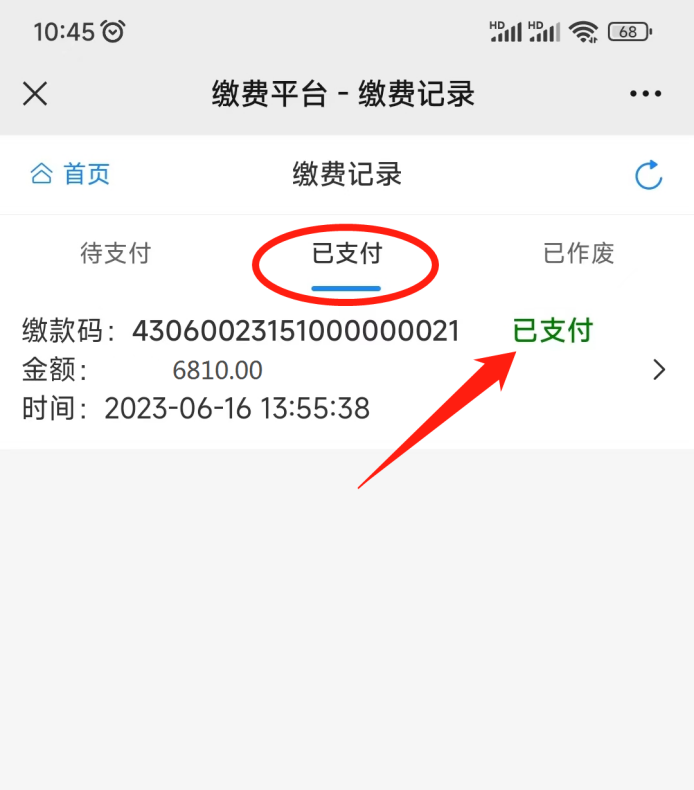 第一步:返回“自助缴费平台”首页,点击“我的记录”,点击“已支付”;