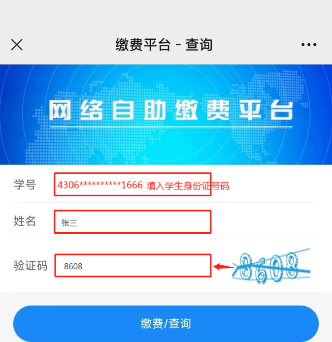 第三步:填写学生身份证号码、姓名和验证码,点击“缴费/查询”;