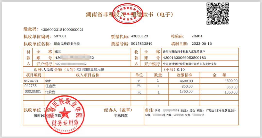 附:《湖南省非税收入一般缴款书(电子)》票据样式: