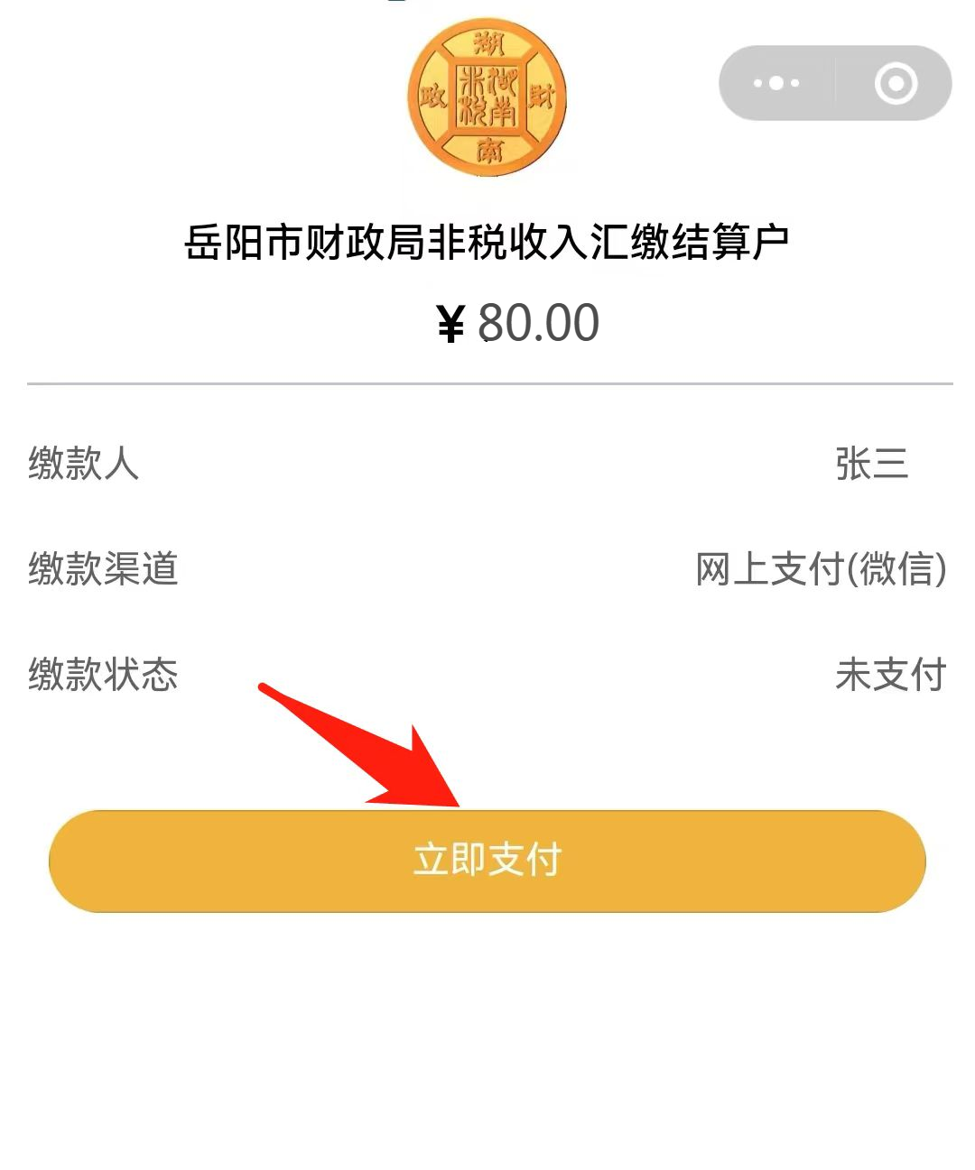 第六步:跳转至“湖南非税收缴服务平台”小程序,点击“立即支付”;