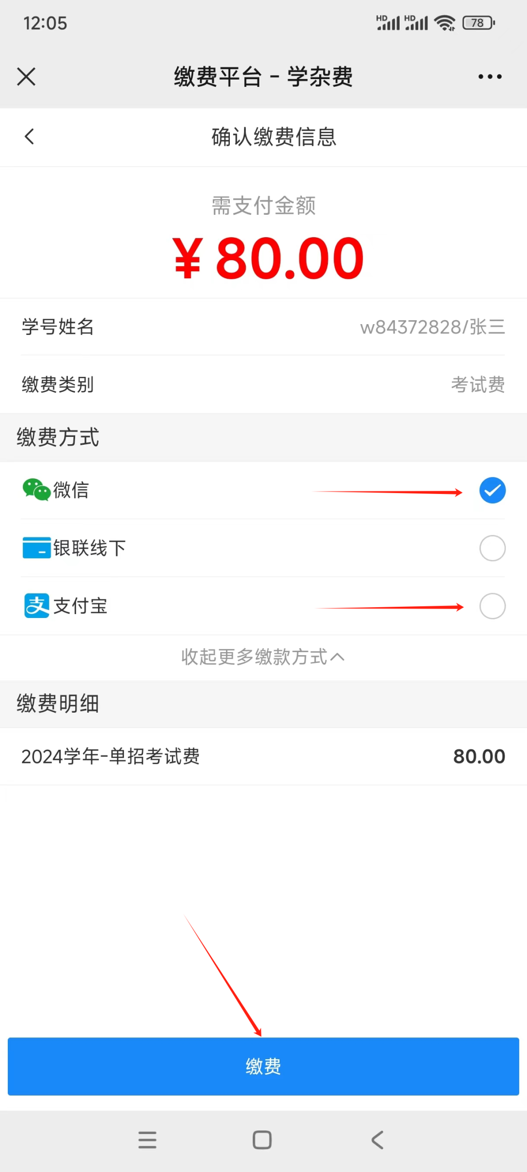 第五步:勾选需要交费的项目“单招考试费”,点击“去支付”,选择缴费方式,点击“缴费”;
