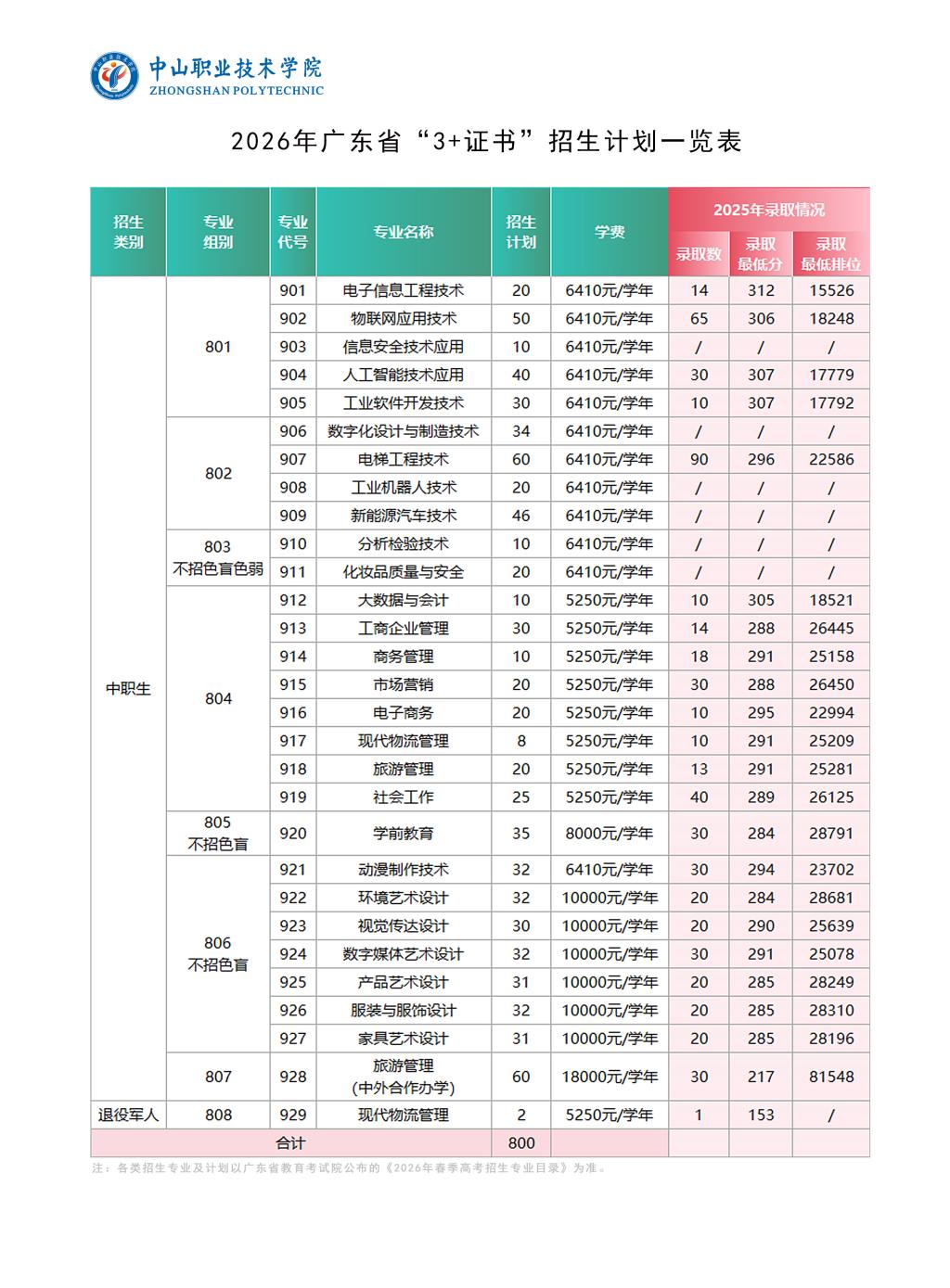 中山职业技术学院2026年春季高考招生计划