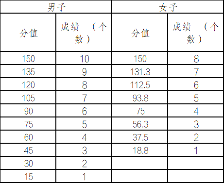 计取成绩得分时,以评分标准中成绩对应的得分计取,若成绩在评分标准中的两个相邻分值之间,则按其中较高的分值计分。