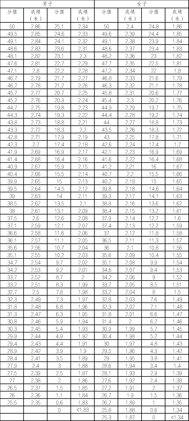 专业总分(四舍五入保留1位小数)=100米跑得分+立定跳远得分+专业技术项目得分。