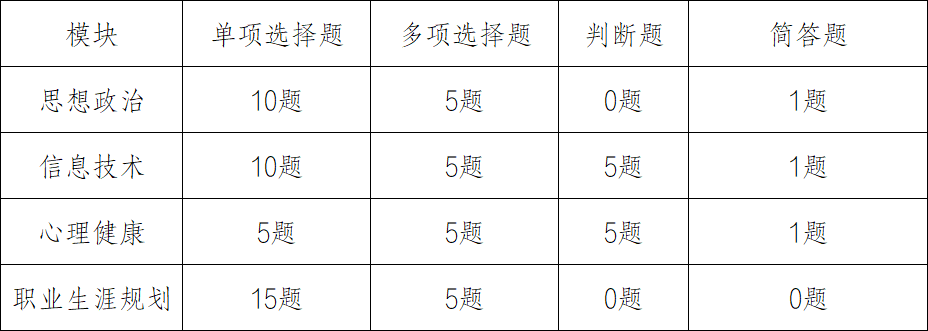 考试内容主要测试考生思想政治、信息技术、心理健康、职业生涯规划四大模块基础知识和应用能力。