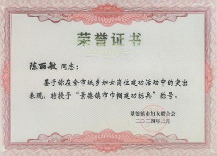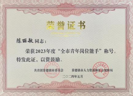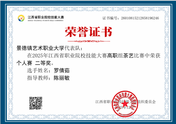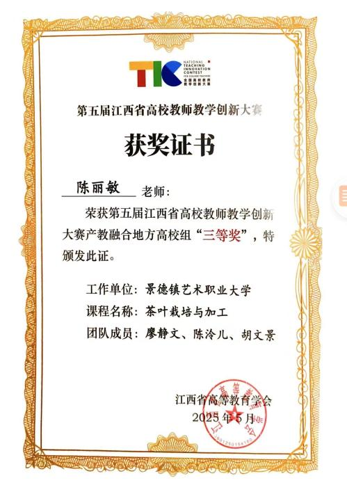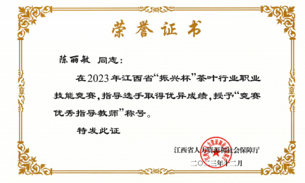 教师个人奖项:江西省技术能手、江西省高技能人才、江西省巾帼建功标兵、江西省茶叶职业竞赛优秀指导教师、景德镇市技术能手、景德镇市巾帼建功标兵、景德镇市高技能人才协会常务理事