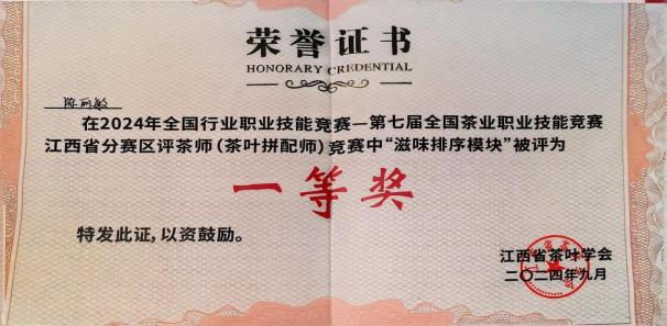 2024年第七届全国茶叶职业技能竞赛江西省分赛区“河红杯”评茶师(拼配师)竞赛“滋味排序模块”一等奖