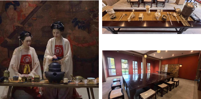 (2)唐代茶文化实训室:唐代煎茶法实训室复原陆羽《茶经》场景,配备仿唐家具、风炉、茶釜、碾槽等1:1复刻器具及越窑青瓷茶碗,营造“茶禅一味”的历史氛围。开设“唐代茶文化”专题课程,每期容纳15人,用于中外文化交流、唐茶雅集及茶史研究实践,助力学生深入理解唐代煎茶技法与文化源流。