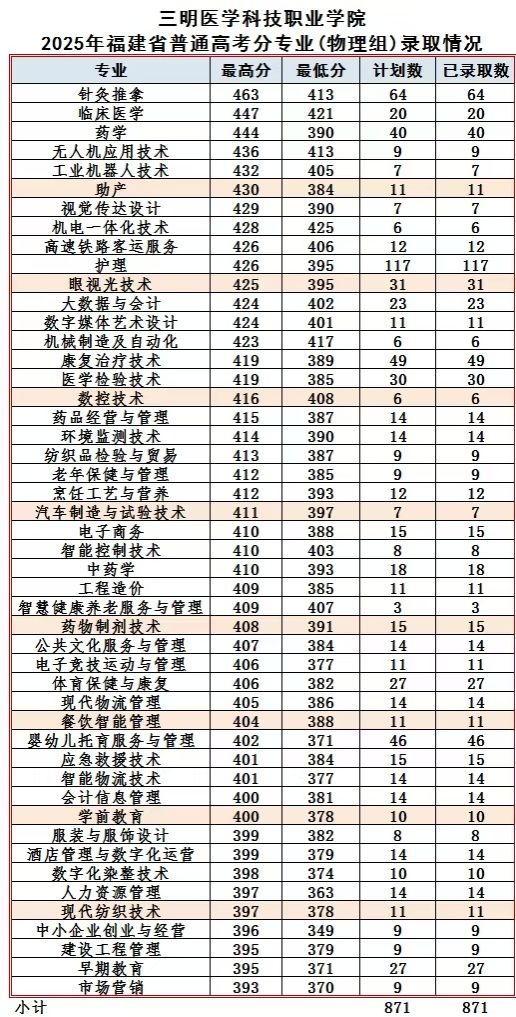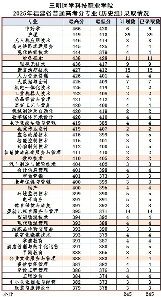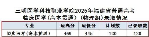 学院2025年福建省普通高考分专业录取分数参考