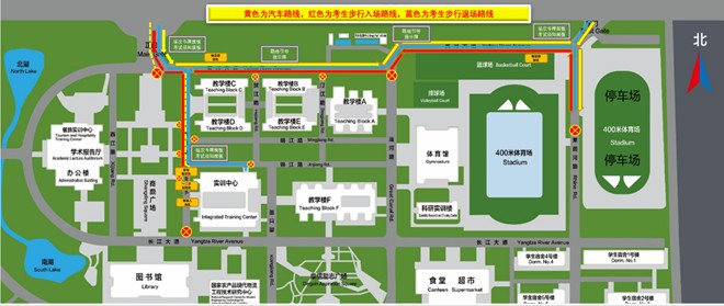 进出校园通道:学校正门东侧道闸允许考生、大巴车和小客车通行,学校东门允许考生和小客车通行。为保障考试秩序,车辆进入停车区前不准停车,乘车考生中途不允许下车,乘车直接到达东操场停车区后,按照指示路线步行进入考试封闭区。