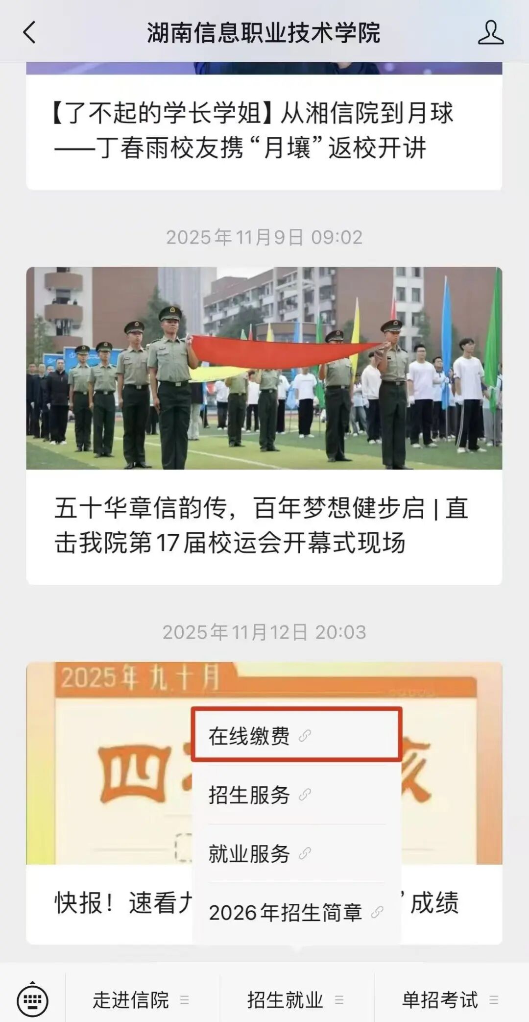 点击“招生就业”选择“在线缴费”