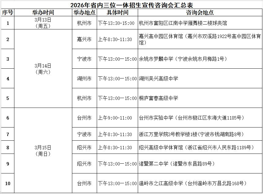 5.综合测试:4月12日测试,地点在浙江水利水电学院钱塘校区。详细信息届时见三位一体综合测试公告;