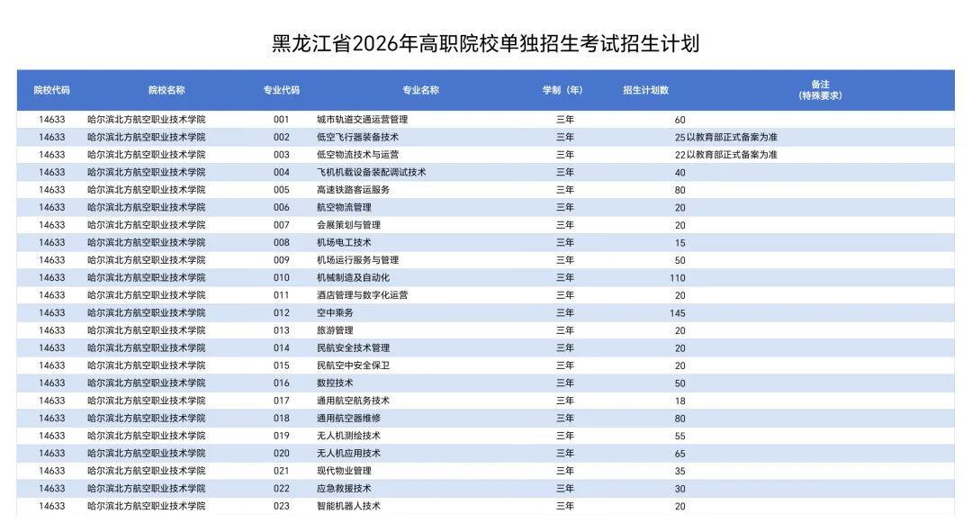 哈尔滨北方航空职业技术学院2026年高职单招招生计划