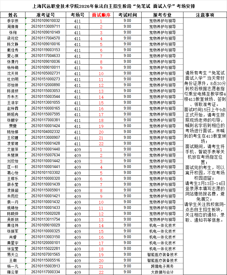 上海民远职业技术学院2026年依法自主招生阶段“免笔试 面试入学”考场安排