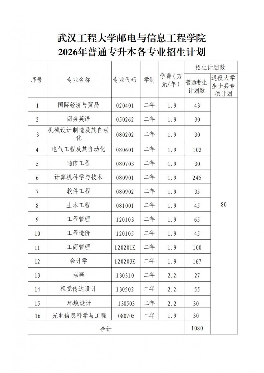 学院2026年普通专升本各专业招生计划