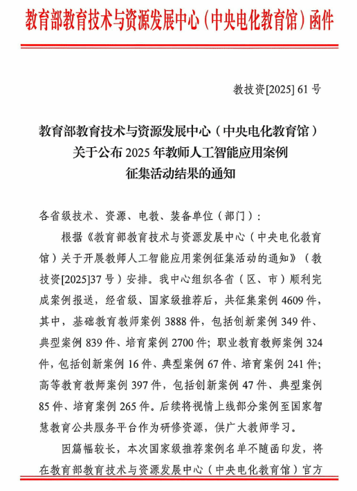 此次教师人工智能应用案例征集活动由教育部教育技术与资源发展中心(中央电化教育馆)组织,经各省(区、市)选拔并推荐,最终在全国范围内遴选出高等教育教师人工智能教学创新案例、典型案例和培育案例。其中,全国培育案例仅265件。入选案例后续将在国家智慧教育公共服务平台集中展示。